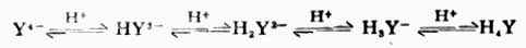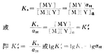 式(7-6)中的[Y]是指平衡时的[Y4-],不包括EDTA其他存在形式,故称Ks为配合物的绝对常数,它与溶液的酸度无关。表7-2中所列数据均为绝对稳定常数。由于EDTA是弱酸性的配合剂,因此溶液的酸度对EDTA配合物的稳定性有很大的影响。 1.酸度的影响 酸度的影响可用下式表示:
