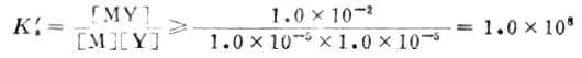 式中Ks' 是考虑了酸效应的稳定常数,叫做条件稳定常数或表观稳定常数,在不同酸度下,KS是不变的,但由于aH随酸度增大而增大,故Ks'则随酸度的增大而减小。在配合滴定中,要求反应量的完成,Ks'越大,反应进行得越完全。 如被测金属离子的初始浓度为0.02mol·L-1,当反应完全时,金属离子基本都配合成MY,即得[MY]=1.0×10-2mol·L-1,设测定的允许误差为0.1%,则滴定达到平衡时, [M=[Y]≤1.0*10-2*0.1%=1.0*10-5(mol·L-1) 将这一关系代入式(7-10)则得