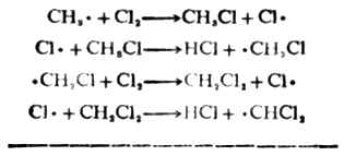 反应由此开始,所以这个步骤叫做链的引发。氯自由基很活泼,它夺取甲烷分子中的氢结合为氯化氢,产生甲基自由基。 Cl·+CH4→CHl+CH3· CH3·和CL2反应,夺得一个氯原子,生成稳定的CH3CL,同时又有一个新的CL·产生。