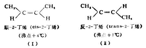 在烯烃的构造异构体中,有一种是碳链异构,即骨架不同的异构现象。如1-丁烯(或2-丁烯)与2-甲基-1-丙烯;另一种是由于双键的位置不同,如1-丁烯和2-丁烯。这种由于官能团位置的不同而产生的异构现象叫做位置异构。碳链异构与位置异构都属于构造异构。 (二)顺反异构 除上述两种异构现象外,由于以双键相连的两个碳原子不能绕σ键轴自由旋转,所以当两个碳原子上各连有两个不同的原子或基团时(如2-丁烯),双键上的四个基团在空间就可以有两种不同的排列方式,即两种构型。
