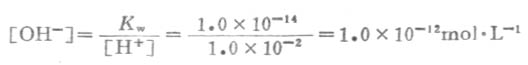 当向水中加入酸时,溶液中[H+]就会增大,设达到新的平衡时该溶液的[H+]为1.0×10-2mol·L-1,因[H+][OH-]=1.0×10-14,则