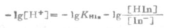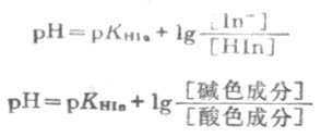 或 由式(3-8)可知,溶液的颜色决定于碱色成分的浓度比值,而此比值又与PH和PHHin值有关。一定温度下,对指定的某种指示剂,PHHin是一常数。所以碱色成分与酸色成的浓度比值随溶液PH值的改变而变化,溶液的颜色也随之改变。例如,在酚酞指示剂溶液中加入酸时,H+就大量增多,使酚酞的离解平衡向左移动,这时酸色成分增多,碱色成分减少,溶液的颜色以酸色为主,酚酞在酸液中是无色的。反之,如向溶液中加碱时,则平衡向右移动,碱色成分增加,酸色成分减少,溶液的颜色就以碱色为主,酚酞在碱液中是红色的。所以指示剂可用以指示溶液的酸碱性或测定溶液的PH值。